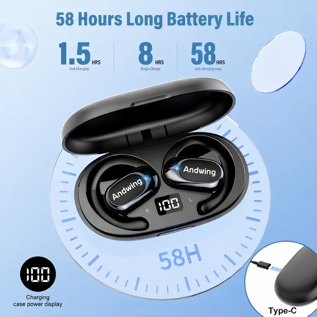 Andwing Open Ear TWS Earbuds Bluetooth 5.4 with Ear Hooks, HiFi Sound 58 Hours Battery, Lightweight Wireless Headphones for Running Fitness Travel IPX7 Sweatproof